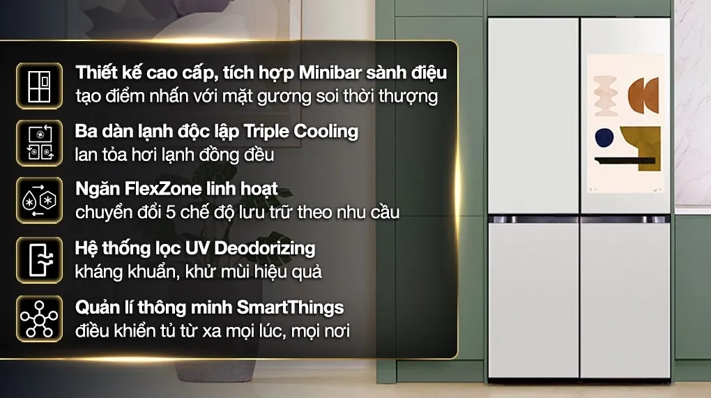 Điểm đặc biệt trong thiết kế là quầy minibar tích hợp, giúp bạn dễ dàng lưu trữ thức uống yêu thích. Với hai ngăn chứa rộng rãi cùng bình tự động làm đầy nước dung tích 1.4L, bạn có thể sáng tạo đồ uống như Detox hay Coldbrew bất cứ lúc nào. Bình nước được thiết kế an toàn, không chứa BPA, đảm bảo sức khỏe cho gia đình.